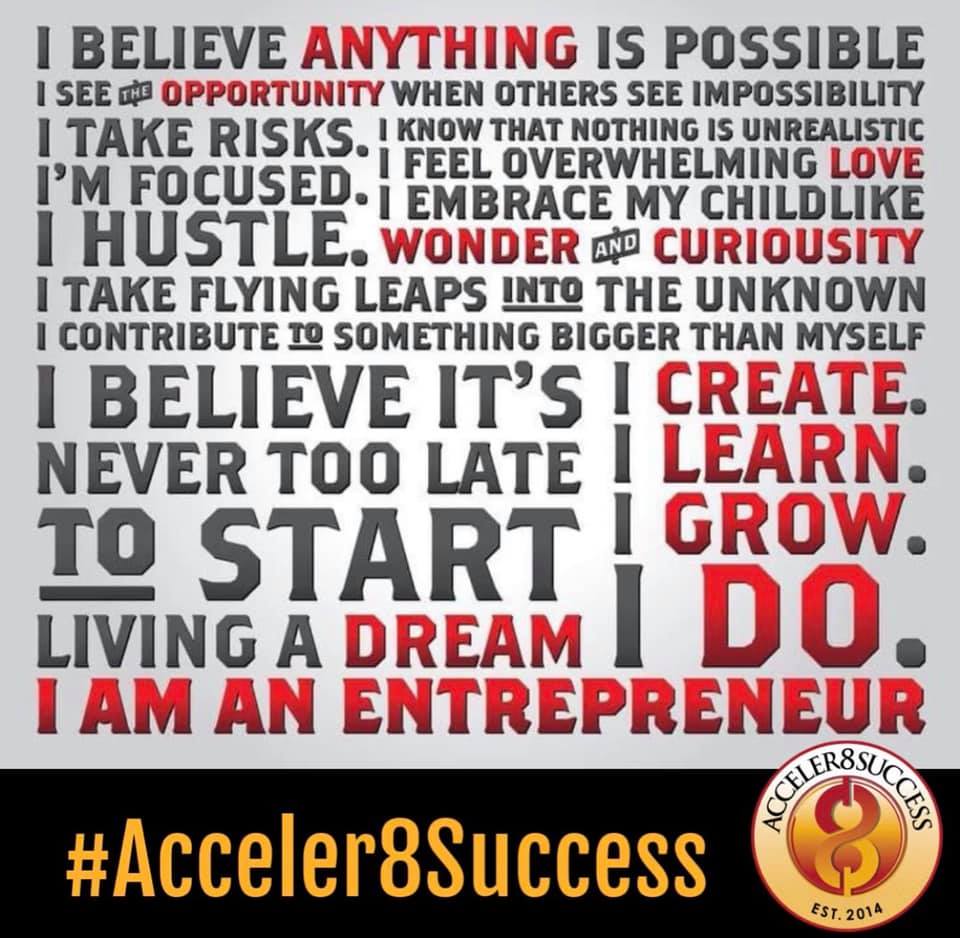 Our goal is to help current and aspiring entrepreneurs architect a plan of continuous accelerated movement toward a pinnacle of desired success, even if and when previously thought to be unattainable. This process has been developed around our proven e-IDEA (explore, identify, develop, execute & analyze) methodology. Deployed effectively, it is key to sustainability and ultimately, to success… Acceler8Success! Learn more.